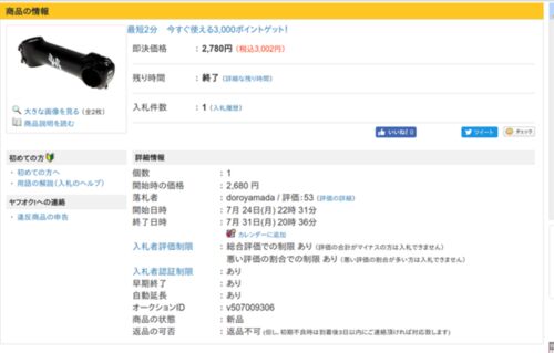 ヤフオクでステム落札。2,780円。