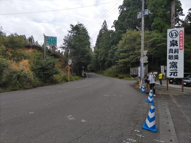 小石原の最初のKOMで応援すべく、その近くの駐車できるスポットに駐車して、自転車でコースに到着。が、すでに交通規制が始まっていて、すぐそこのKOMには行けなかった。