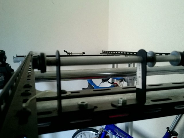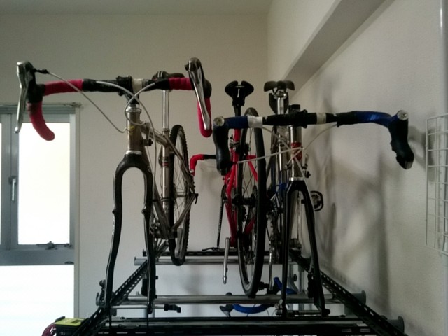 これにL型アングルを組み合わせて組み立てた。ハンガーとアングルはタイラップで結わえてある。今回の目標はこれを4台積載にすること。そのためには同じ向きに並んだ2台のハンドルが干渉しないようにする必要がある。あわせて、クイックリリースの5mmシャフトで直接フォークを受けているところをもう少し太いもので受けるようにすること。