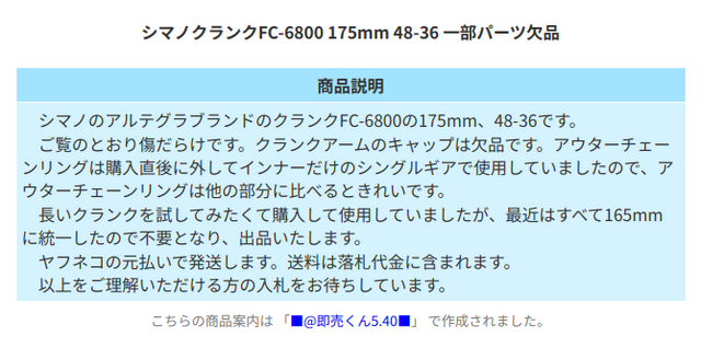 アルテグラFC-6800 175mmクランクをヤフオク出品。送料込み1500円スタート。(写真は6月1日時点)