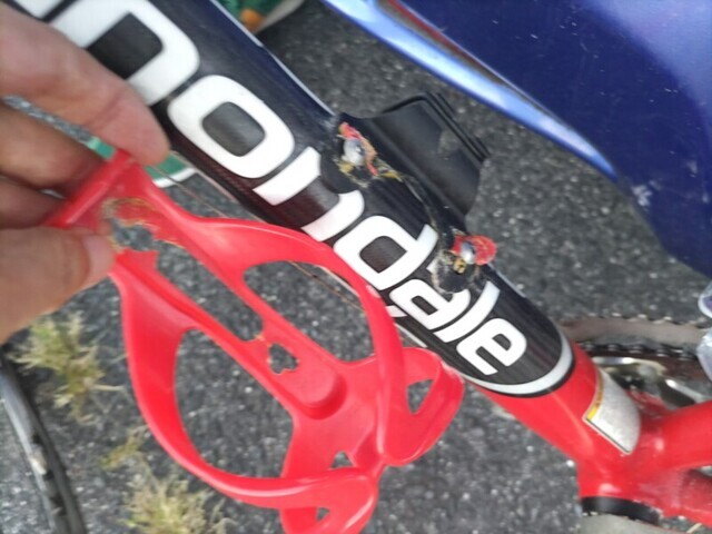 終わってボトルケージからボトルを引き抜く(レース中は使わず)と、ボトルケージまで崩壊。プラスチックも汗でどうかなるん?