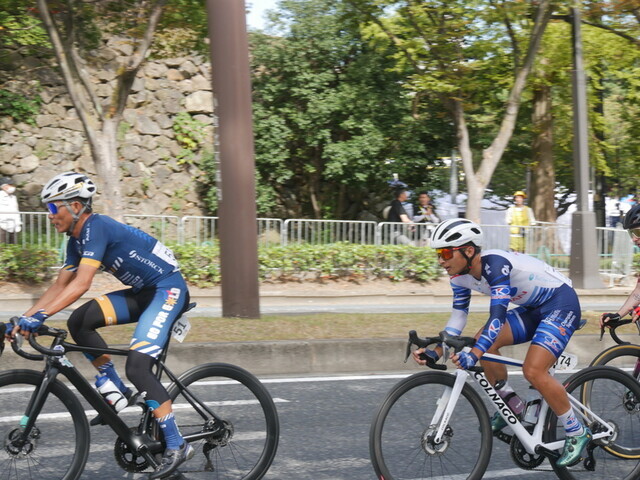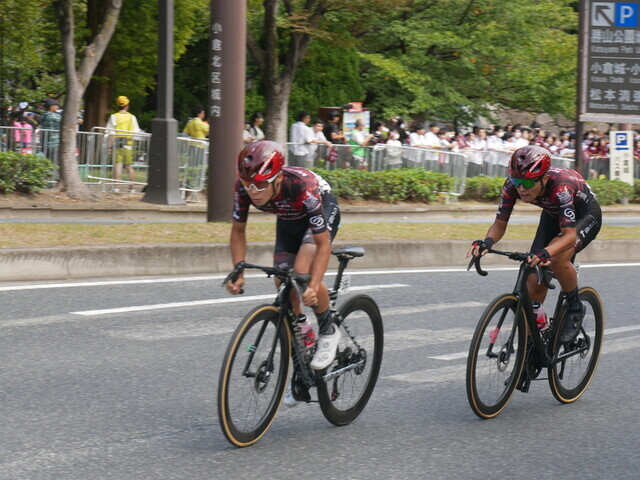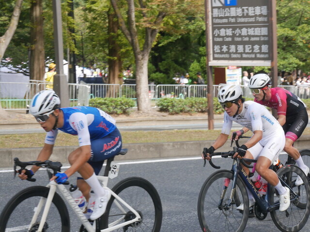 終盤フィニッシュ地点近くに来たら、最終コーナーを見渡せる絶好のスポットがあいていた。ここでゴールまで観戦。