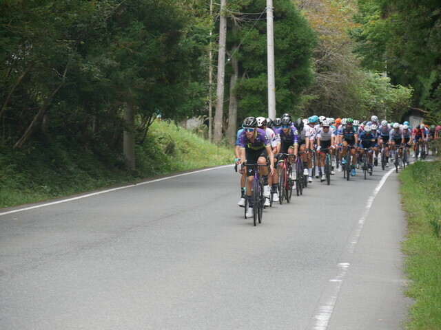 小石原の最初のKOMで応援すべく、その近くの駐車できるスポットに駐車して、自転車でコースに到着。が、すでに交通規制が始まっていて、すぐそこのKOMには行けなかった。