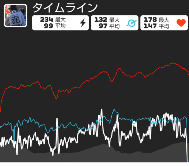 頂上手前でちぎるが、下りで抜かれ、平地になったあたりで追いつく。