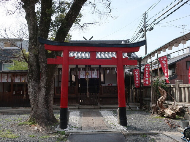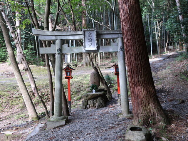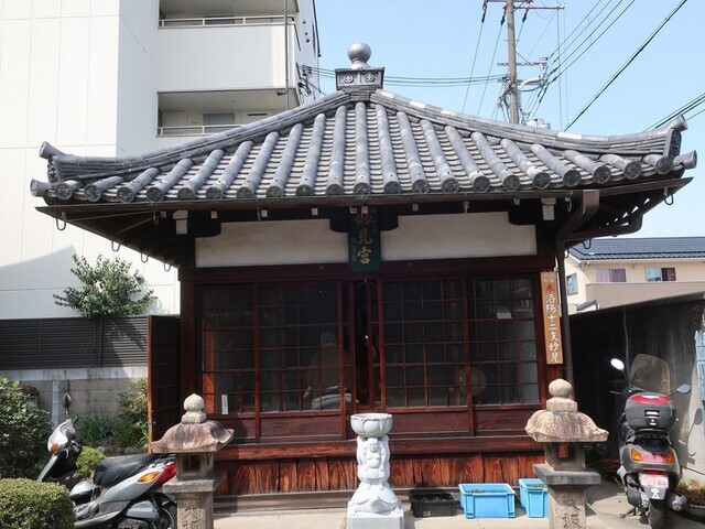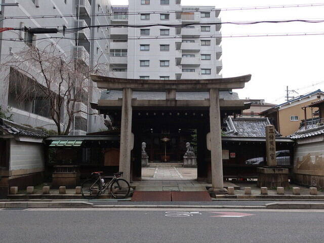 GoogleMapsで松尾三宮神社の近くに鳥居マークがあるのを見つけて訪問。かつては境内摂社だったのかと思わせる位置関係。鳥居はない。奥に見えるのは松尾三宮神社の鳥居。