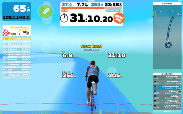 夜Zwift。Climb Portal のCrow Road。クライム部は7.0kmで251mアップ、平均4%。