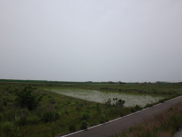 下ってきた山元町の海沿いの県道38号(相馬亘理線)を進む。津波の被害を受けたエリアで、県道自体が防潮堤も兼ねているようだ。