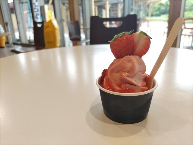 その隣のやまもと夢いちごの郷で休憩。いちごの食べきりサイズパックはなかったので、ソフトグリームで。娘苺(こいちご)500円。ちなみに一番高いのは姫苺1200円。