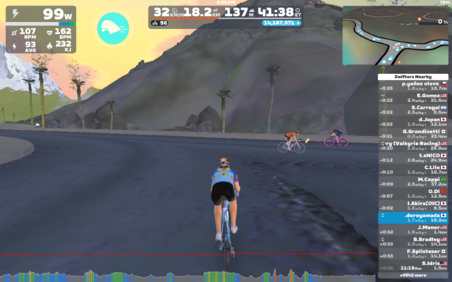 Zwiftは目先を変えてオリジナルコース。Volcano島を時計回りに半周して、Italian島を反時計回りに4分の3周、Downtown島の西の道のアップダウンを通って再びVolcano島に。