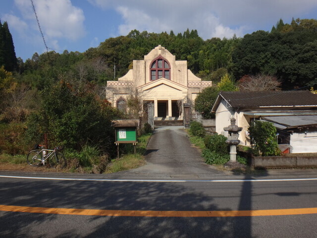クルマで朝地の体育館まで行ってスタート。晴れていて温かいが、風は強め。Edgeでナビゲーションを設定したが、ナビゲーションどころかルートさえも表示しない。おかげで間違えてR442を少し遡ってしもうたがな。おかげで変わった意匠のお寺さんに遭遇。浄土真宗本願寺派源勝寺というらしい。