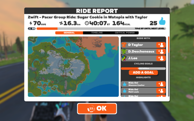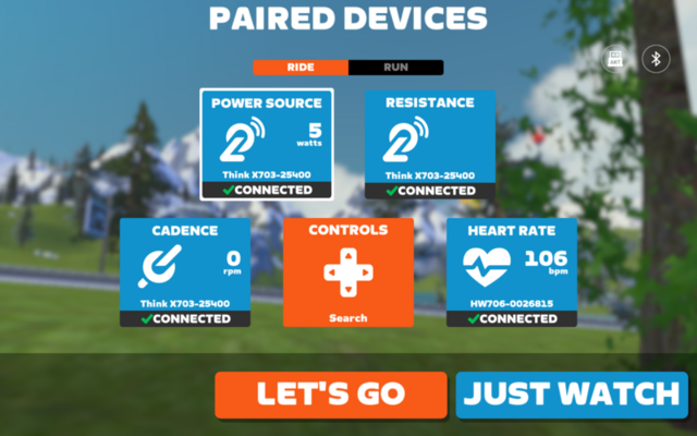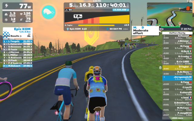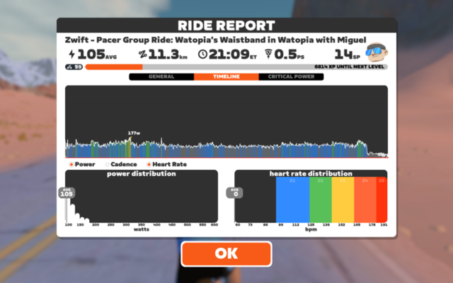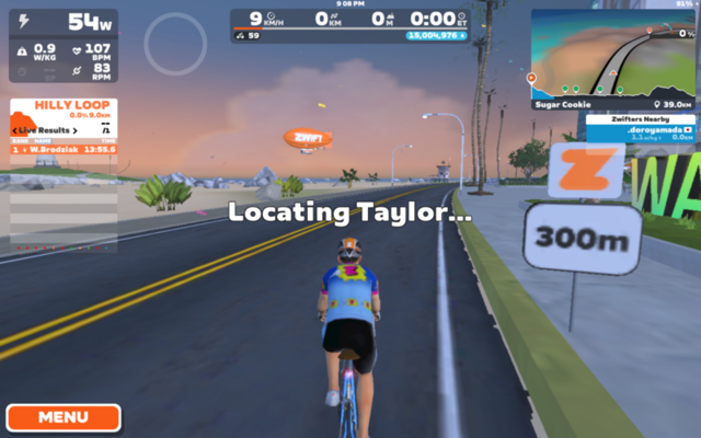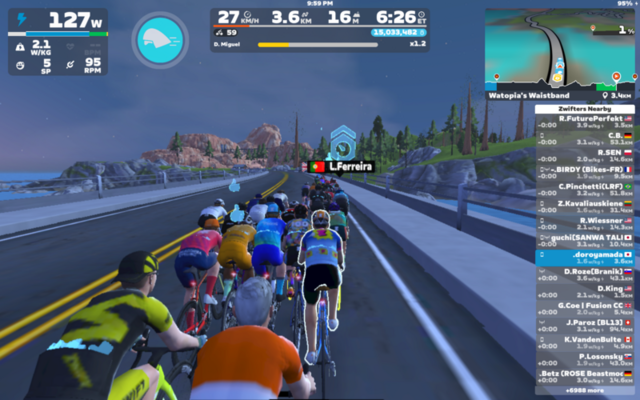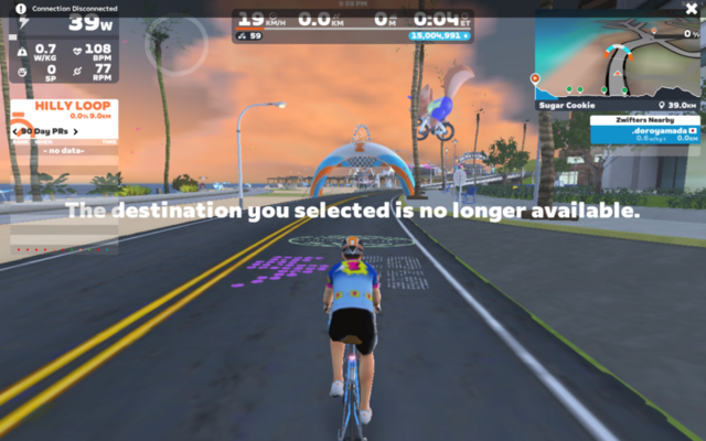 続いてMiguelと。コースはWatopia’s Waistband。今度はスムーズに合流できた。と思っていたが、今スクリーンショットを見たらさっきと同じメッセージが出て、Connection Failureのプルダウンが出とる。コネクトできたハートレートセンサーはずっとno signal。やはりbluetooth周りか。センサーは充電切れの可能性もある。