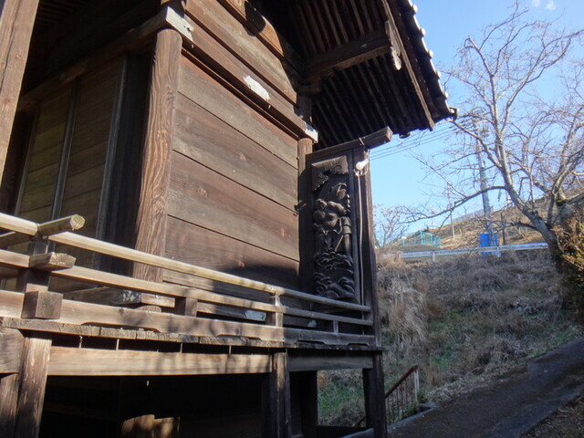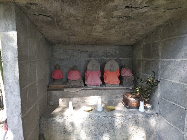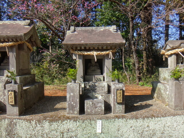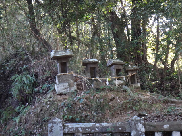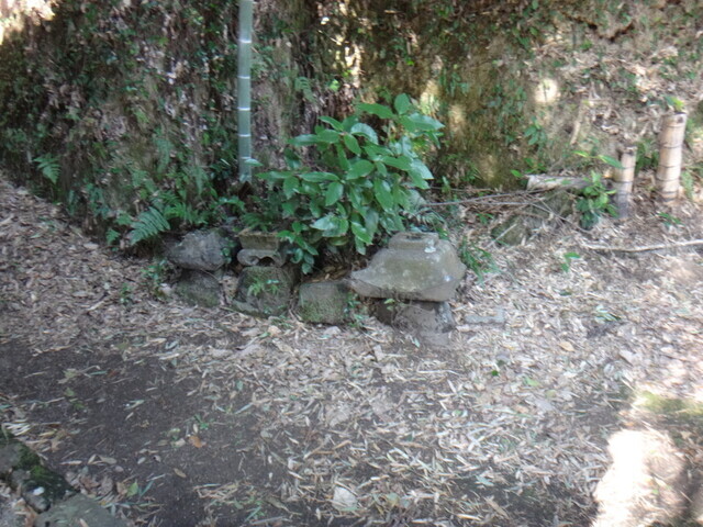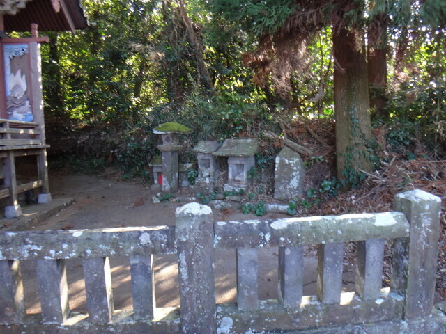 本殿の向かって左後方の祠・石塔群。正面の石には「堅牢地神」と刻んである。