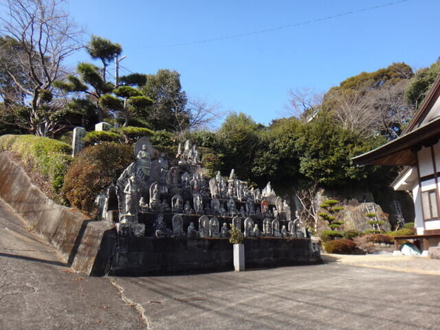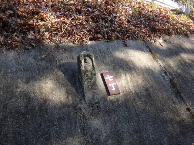 田尻小学校の脇から霊山寺への道を登り始める。一丁ごとにお地蔵さんと表示がある(写真は復路に撮影)。新しいお地蔵さんと古そうなお地蔵さんが混在。