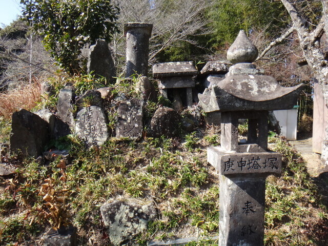 途中に石塔。最初のやつ、田申塔と刻んである。最初田を四と思って「見ざる、言わざる、聞かざるの3申だけやん」と思った。入口の灯籠には安政5年の刻み。