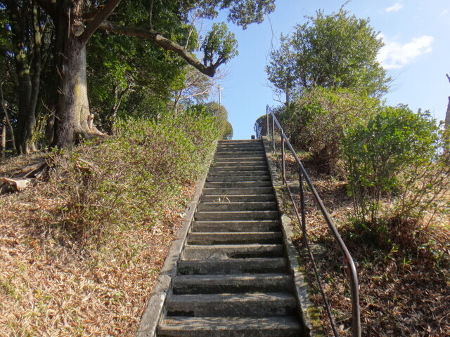 南側に団地から直接登る階段があった。手前は参拝者専用駐車場。中段はフラットだけど、隣にあがの児童公園があるためか、遊具はない。