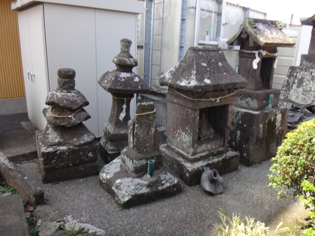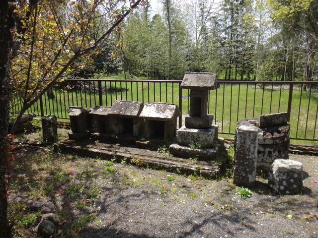 右区の祠群。6連は右から秋葉社、保食社、愛宕社、八坂社、牛王社、佐比社。牛王社は熊野牛王符由来か。佐比社は佐比持神?雄城神社と同じ頃に近所から集約されてきたのではないかと思われる新しさだが、創設年の刻はなかった。