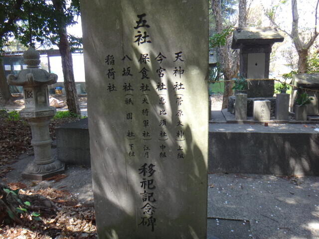 本殿裏手の祠。左から天神社、今宮社、保食社、稲荷社、八坂社。平成9年に近隣の祠を集約したらしい。桑本天満社と同じ年ということは、ホワイトロードやトキハわさだタウンの建設が関連していそう。