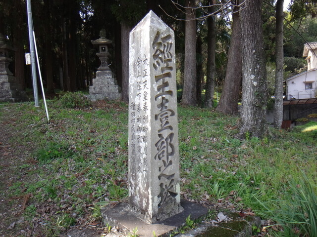 参道の二宮金次郎、昇格記念碑、経王壱部の塔、手水鉢。経王壱部の塔の側面には大正天皇への報恩と今上天皇(昭和天皇)の武運長久祈願が書かれている。この時期でも神仏分離が徹底されていたわけではなかったということか。
