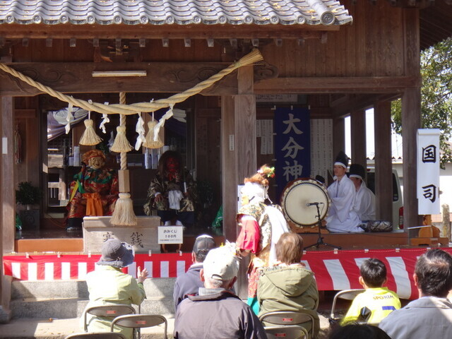 ホワイトロードを越えて大津神社に来てみたら太鼓の音が大きくなった。雄城神社や日枝神社で聞こえてたやつ、わさだタウンのイベントかと思っていたが、神楽の奉納だった。氏子によるものではなく、大分神楽社という神楽社による奉納だった。後で調べたら、春と秋に大津神社で奉納があり、次の参拝予定地の浅草神社でも奉納があるらしい。