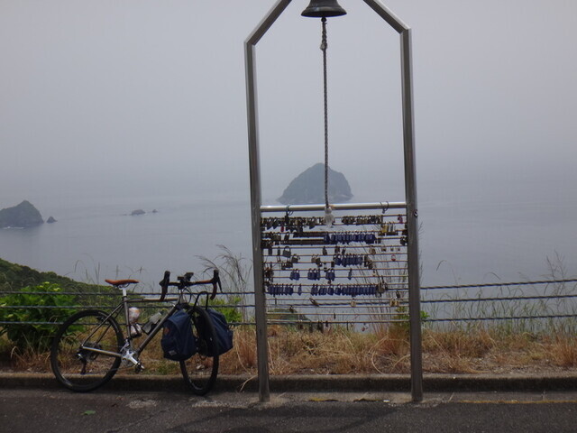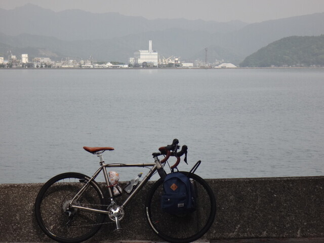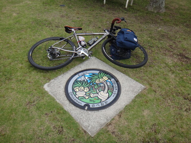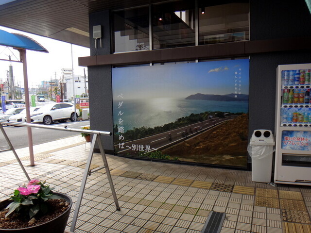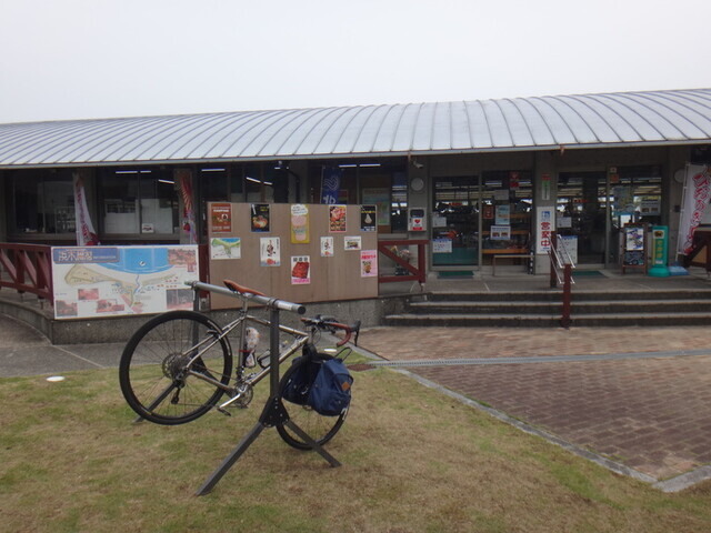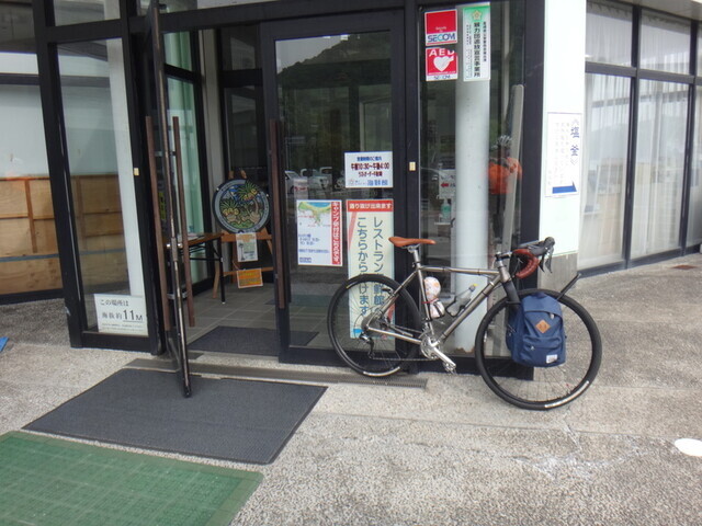 蒲江のAコープで調達して道の駅かまえでスーパーアゲアゲランチ。Aコープのサイクルラック、このままでは使えへん。前に引き出して使い、終わったあとは戻した。